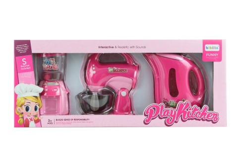Sada domácích kuchyňských spotřebičů. Napájení na baterie(nejsou součástí balení)-konvice 2xAA(po zapnutí svítí a vydává zvuky vaření), šlehač 2xAA(po zapnutí svítí a metly se točí), mixér není na baterie. Rozměry balení 39x16x8 cm. Věk 3+