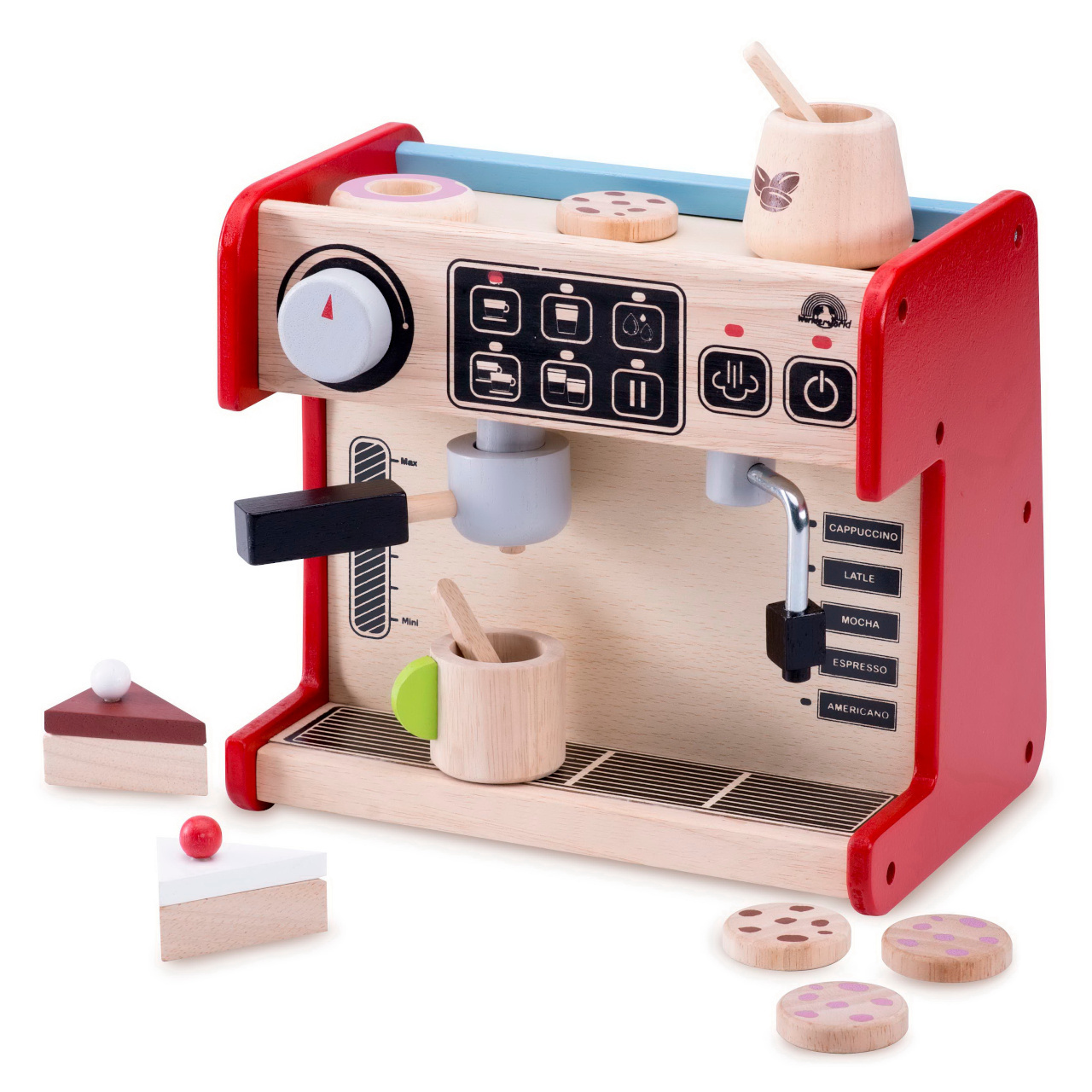 Souprava kompaktního a přenosného kávovaru pro děti, které si rády hrají na baristy, Vás překvapí propracovanými detaily. Na jedné straně naleznete kávovar s odnímatelnou pákou a pohyblivým dávkovačem mléka i ovládací displej s otočným cvakajícím knoflíkem a malovanými tlačítky. Do poliček na druhé straně kávovaru můžete vystavit dezerty dodávané se soupravou. Součástí balení je také další nádobí. Sada nabízí odolné masivní provedení a kombinuje atraktivní syté barvy s barvou přírodního dřeva. Hlavní vlastnosti:kávovar s pákou, hrneček, dóza, 2 lžičky a 7 sladkostíoboustranná kompaktní konstrukceodnímatelná páka, pohyblivý dávkovač mlékaotočný knoflík vyluzující zvukvitrína s dvojicí polic