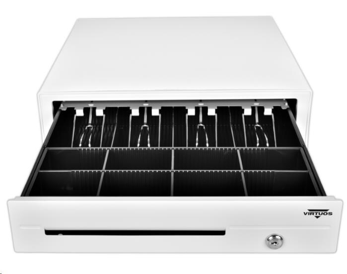 Virtuos pokladní zásuvka C420D - s kabelem, kovové držáky, 9-24V, bílá