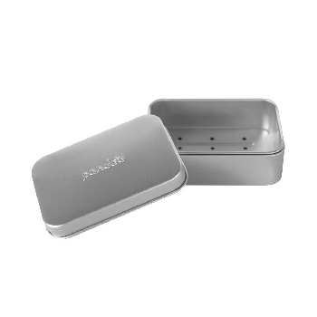 Jednoduchá a stylová cestovní hliníková krabička na mýdlo s vyjímatelnou odkapávací mřížkou. Vyjímatelná odkapávací mřížka má tu výhodu, že mýdla mohou schnout v uzavřené nádobě, aniž by se přilepila na dno krabičky nebo změkla.