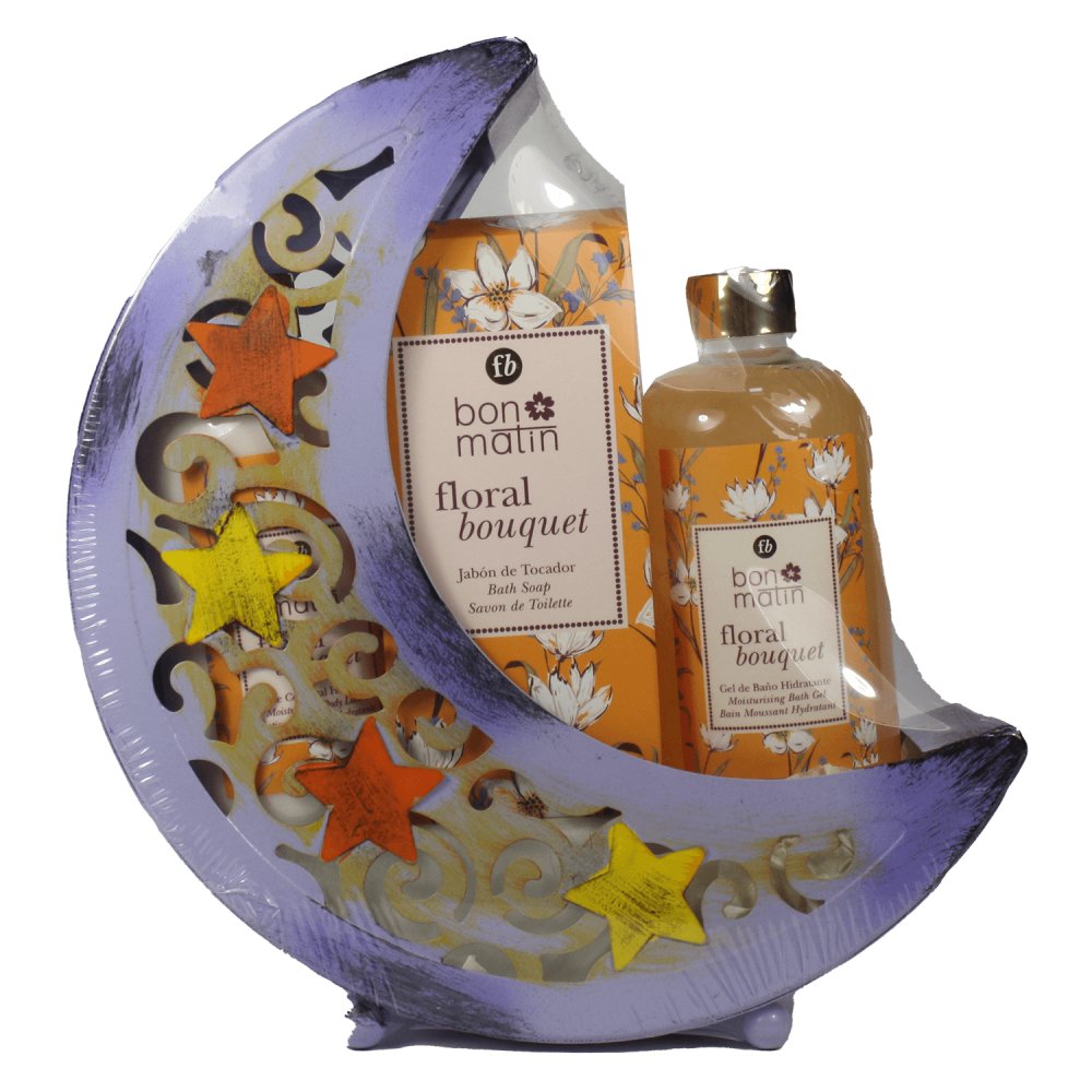 Dárková sada značky Bon Matin floral bouquet s dekoračním plechovým předmětem ve tvaru měsíce obsahuje 250 ml hydratační sprchový gel, 250 ml hydratační tělové mléko, 100 g toaletní mýdlo