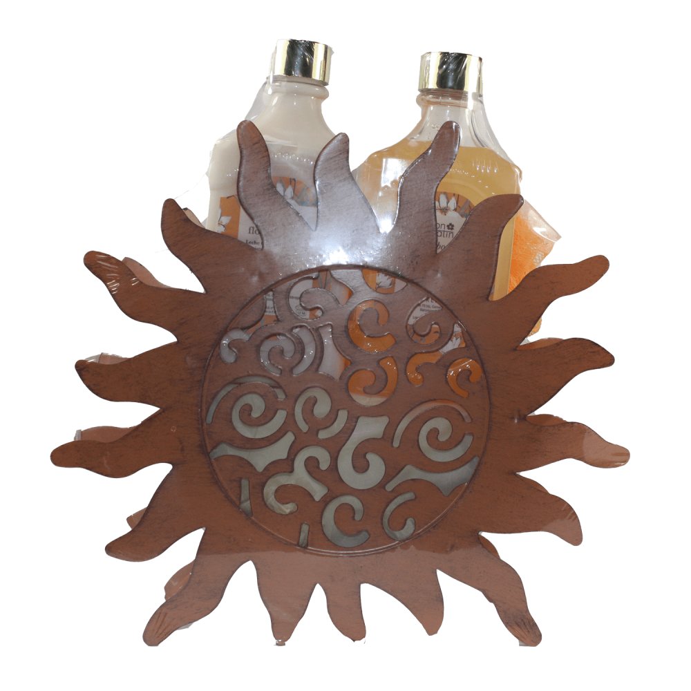 Dárková sada značky Bon Matin floral bouquet s dekoračním plechovým předmětem ve tvaru slunce obsahuje 200 ml hydratační sprchový gel, 200 ml hydratační tělové mléko, 50 ml krém na ruce, žínka
