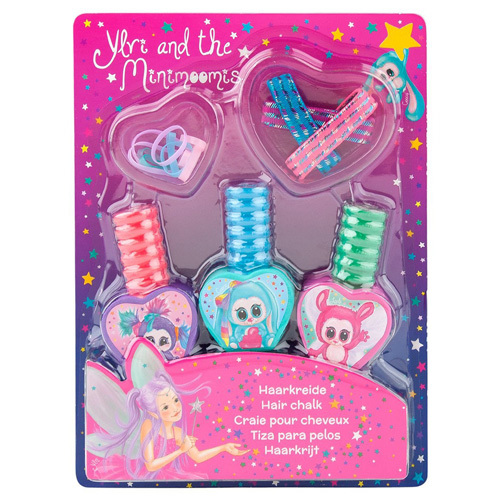 Krásná sada na vlasy značky Ylvi and the Minimoomis pro všechny malé slečny, která rády experimentují se svým účesem. S touto kreativní sadou dostane hra na kadeřníka jiný rozměr. Křídy na vlasy umožňují rychle a jednoduše změnit barvu účesu, stačí vybrat si odstín. Díky této sadě bude Vaše malá slečna své okolí stále překvapovat originálními účesy a při jejich výrobě si užije spoustu legrace. V balení naleznete 3 barevné křídy (modrá, zelená, růžová), 3 silnější gumičky a 12 malých gumiček. Barva je smývatelná a zdravotně nezávadná.Vhodné pro děti od 3 let.