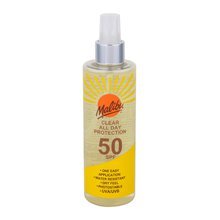 Voděodolný sprej na opalování **Malibu Clear All Day Protection SPF50**. Voděodolný sprej na opalování Malibu Clear All Day Protection SPF50 Vám zajistí ochranu před nežádoucím spálením. Snadno se nanáší díky rozprašovači. Vysoce účinný systém UVA a UVB filtrů poskytuje okamžitou ochranu před spálením pokožky. Lehké, nemastné a voděodolné složení se ihned vstřebává. **Použití**: Aplikujte na pokožku před sluněním. Opakujte během dne, především po koupání nebo osušení.