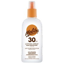 Voděodolný sprej na opalování** Malibu Lotion Spray SPF30** chrání pokožku před slunečním zářením. Složení obohacené o vitamíny pomáhají udržovat přirozenou vlhkost pokožky. Praktické balení ve spreji umožňuje snadnou aplikaci. Snadno se roztírá a ihned vstřebává. ### Dopřejte své pokožce ochranu před sluncem se sprejem Malibu! * hydratuje, * vyživuje, * účinně chrání před slunečním zářením. ### Aplikujte sprej na opalování ve správný okamžik. Aplikujte na suchou a čistou pokožku alespoň 30 minut před sluněním. Opakujte po koupání, pocení se nebo otírání.