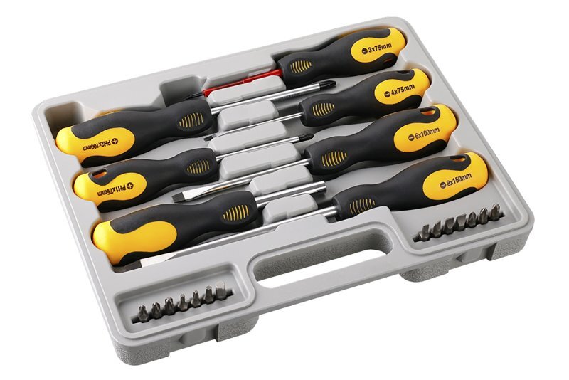 sada šroubováků a bitů 1/4" 25 mm, CrV magnetické koncovky, ergonomická neklouzavá rukojeť obsah sady 21 kusů : 4x plochý šroubovák 475, 6100, 8150 a elektro 375 2x křížový šroubovák PH 175, 2*100 1x šroubovák na bity, 14x bit ploché 4, 5, 6, 7 - PH 1, 2, 3 - PZ 1, 2, 3 - Torx T 15, 20, 25 a adapter šestihran 1/4" / čtyřhran 1/4" plastové pouzdro