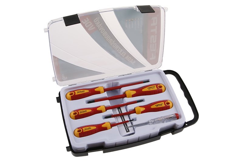 sada 5 ks elektrošroubováků FESTA se zkoušečkou v plastovém kufříku šroubováky mají certifikaci elektro VDE 1000 V, IEC/EN 60900-2004 kovový dřík je vyroben z velmi kvalitní CrV oceli, kalený hrot je magnetický ergonomicky tvarovaná rukojeť, kombinace polypropylenu a pryže zaručuje výborné antiskluzové vlastnosti a dobrou odolnost vůči mazadlům a chemikáliím obsah sady : ploché - 4100, 5,5125 PH - 060, 180, 2*100 elektrozkoušečka do 250V