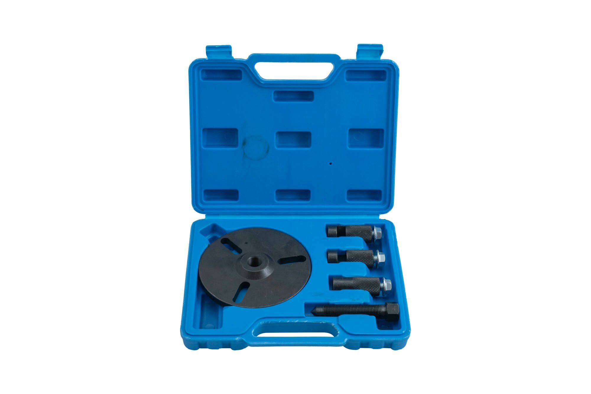 Univerzální stahovák řemenic, ozubených / rozvodových kol vačkových hřídelí má základní desku, 3 nastavitelná, šroubovací ramena a středový šroub.