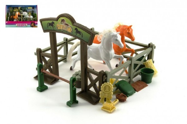 Stáj pro koně + 2ks kůň s doplňky plast v krabici 36x25,5x10cm