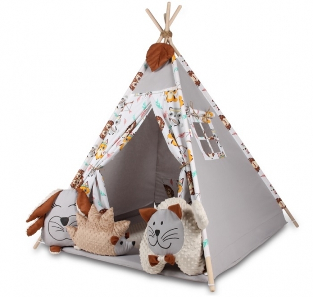 Baby Nellys Stan pro děti týpí s velkou výbavou, Ježek a liška - šedý