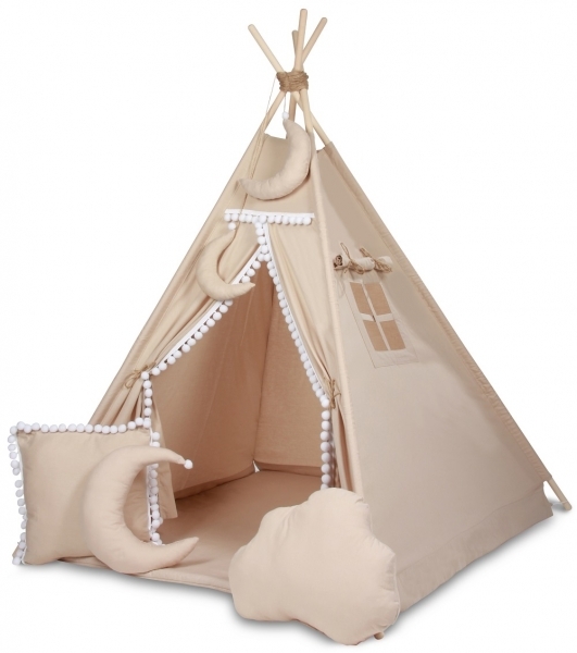 Stan pro děti týpí Baby Nellys + výbava - béžový s bílými bambulkami