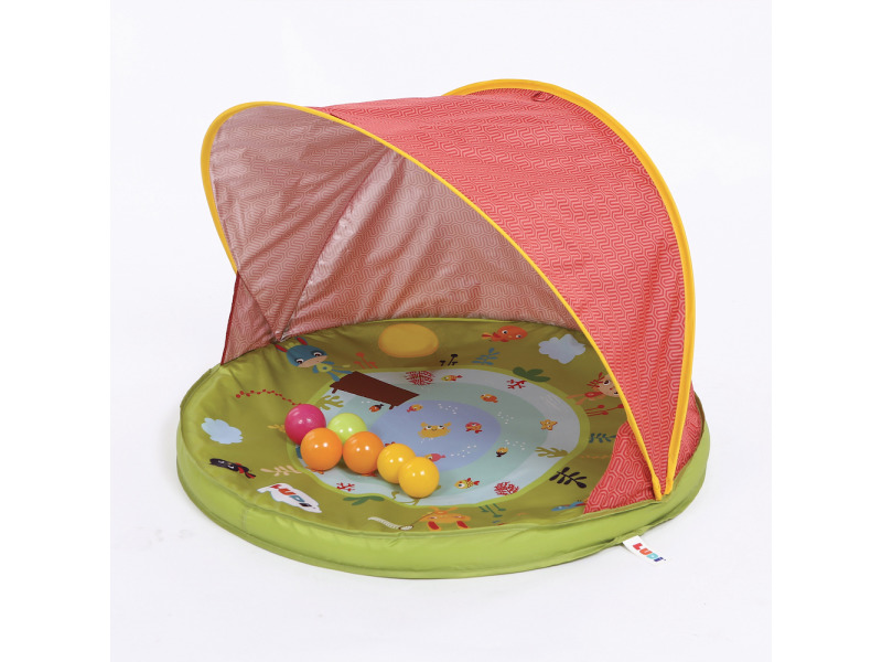 Přenosná mělká podložka se stříškou pro miminko. Stříška s UV faktorem chrání dítě před škodlivým slunečním zářením a větrem. Může zároveň sloužit jako mělký bazének pro osvěžení v horkých letních dnech. Podložku je možné použít i bez vody jako stan pro miminko na zahradu nebo na pláž. Pro více zábavy je součástí balení i 6 míčků na hraní. Jednoduchá instalace pouhým rozložením. Součástí výrobku je přenosná taška, do které stan snadno složíte.