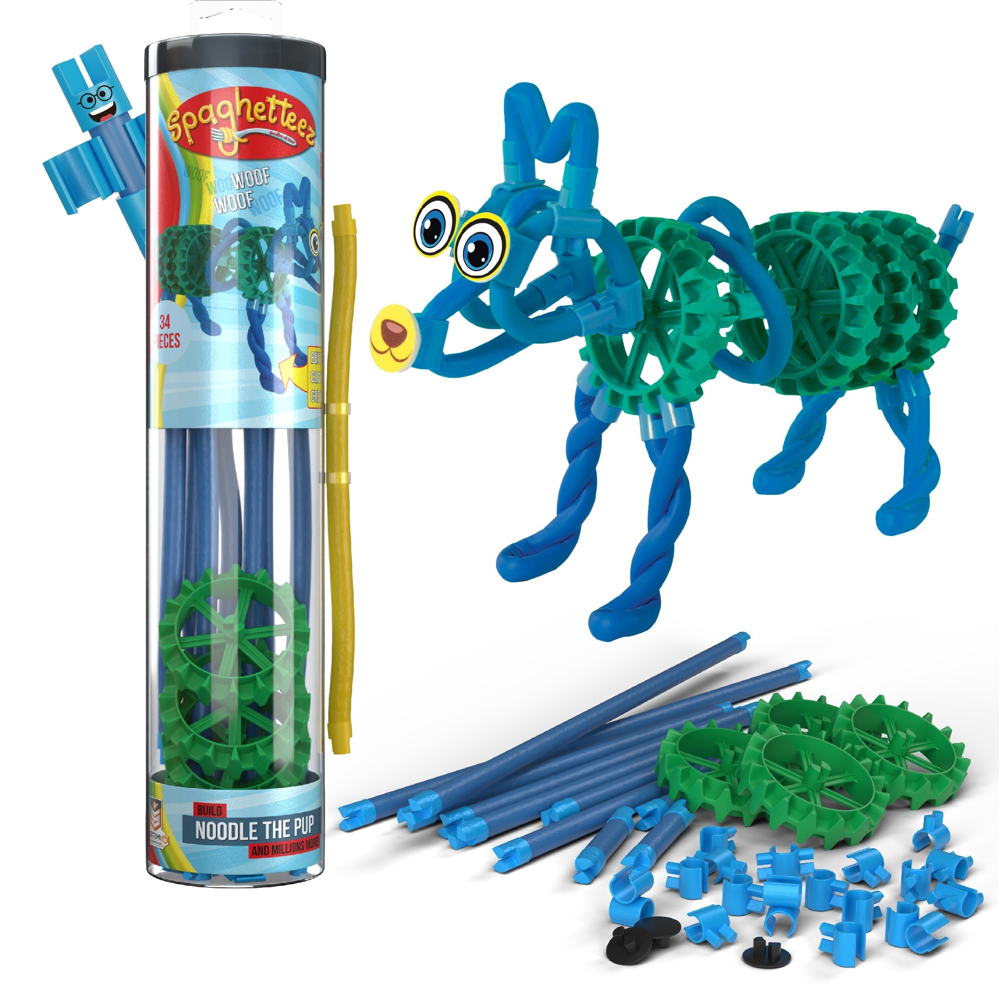 Kreatívna a flexibilná stavebnica pre deti Spaghetteez 34 ks od belgickej značky Clics Toys prináša neobmedzené možnosti tvorby a umožňuje deťom vytvoriť najrôznejšie 2D aj 3D figúrky. Balenie obsahuje rôzne dĺžky flexibilných dielikov v modro-zelenej farbe, ktoré pripomínajú špagety, spolu s ďalšími konštrukčnými prvkami a návodom na tvorbu úžasných modelov. Vďaka špeciálnemu zaklikávaciemu systému na koncoch sa dieliky ľahko spoja - stačí ich spojiť, otočiť a môžete ich začať ohýbať a modelovať.