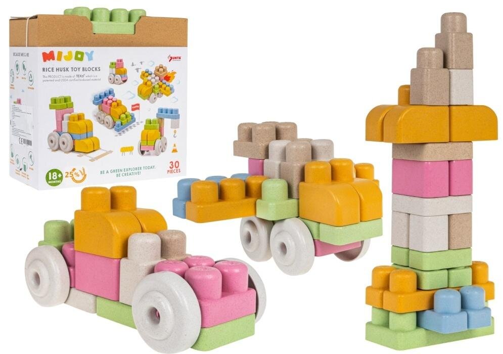 Zestaw zawiera 30 elementów, które można wykorzystać do budowy różnych pojazdów oraz innych kreatywnych konstrukcji. Dzięki zaokrąglonym kształtom i miękkiej strukturze, klocki są łatwe do chwytania i składania, co wspiera rozwój motoryczny i manualny dziecka.