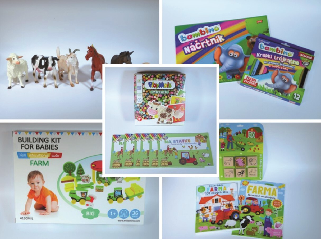 6 kusů razítek Farma1x FARMA Nekonečné omalovánky120 cm (70 samolepek)6x omalovánky Na statku6 kusů domácích zvířátek (vel. 15 cm)1x náčrtník A4 (20 listů)1x BAMBINO Sada trojhrannýchJumbo pastelek 12 + ořezávátko1x MILLAMINIS Farma1x PLAYMAIS Mosaic Farma1x FARMA Kolem dokola 100 nových slov (leporelo)