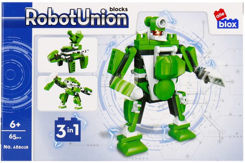 Zalety produktu: klocki zwiększają sprawność umysłową, co przekłada się na kreatywność, pobudzają wyobraźnię oraz pozytywnie wpływają na rozwój dziecka, robot posiada ruchome elementy, robot w zielonym kolorze, możliwość ułożenia z zestawu trzech różnych konstrukcji. Komplet klocków konstrukcyjnych ALLEBLOX to nowość w naszej ofercie. Pozwalają na budowanie urozmaiconych konstrukcji, budowli oraz pojazdów, to idealna zabawa zarówno dla małych jak i dużych konstruktorów Łączą się z innymi popularnymi klockami konstrukcyjnymi, są lekkie oraz łatwe do składania. Zbierz całą serię klocków i złóż jednego dużego robota z 4 zestawów konstrukcyjnych klocków. Zawartość zestawu: 65 elementów klocków, instrukcja do składania. Wszystkie elementy wykonane z miękkiego plastiku. Wymiary/waga/baterie: wymiary produktu dł. x wys. x gł. cm : robot- 9x10x4, wymiary opakowania dł. x wys. x gł. cm : 15x10x5, waga produktu bez opakowania kg : 0,03 kg, waga produktu w opakowaniu kg : 0,06 kg, nie wymagają zasilania bateriami. Produkt przeznaczony dla dzieci w wieku: 6 . Pakowany w kartonik.