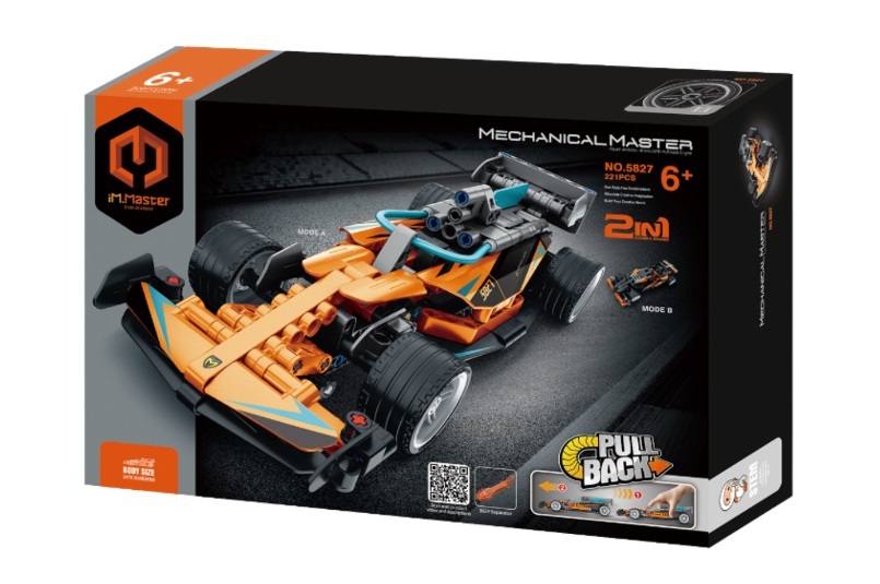 Ten model oferuje możliwość zbudowania sportowego samochodu, który można łatwo przekształcić na inną wersję pojazdu. Mechanizm pull-back pozwala na rozpędzenie auta poprzez pociągnięcie go do tyłu i puszczenie, co sprawia, że zabawka sama rusza do przodu, dostarczając wiele frajdy podczas wyścigów.