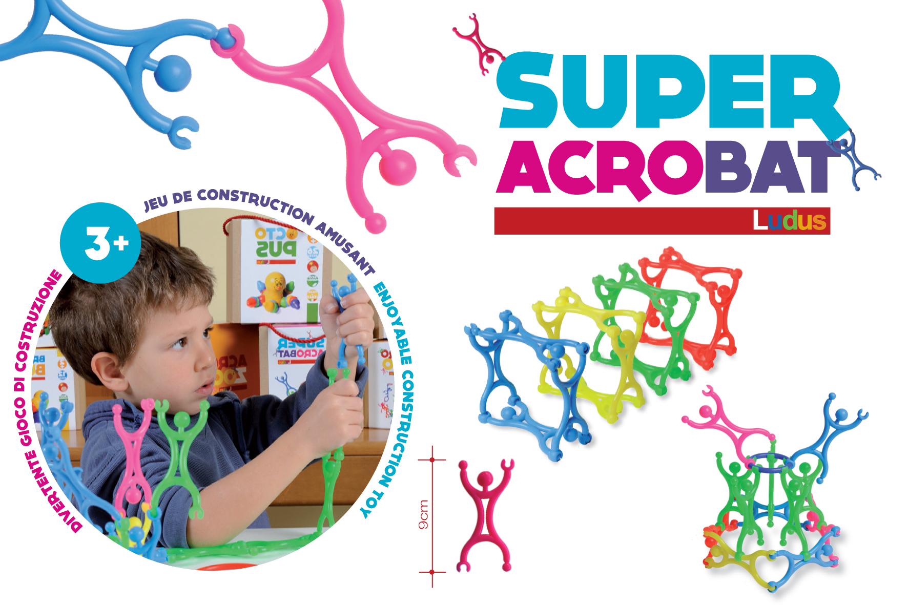 Konstrukční stavebnice SUPER ACROBAT přináší nekonečné možnosti stavění a zábavy. Jednoduché dílky ve tvaru kroužků a panáčků v různých barvách umožňují dětem mnoho variant propojování.