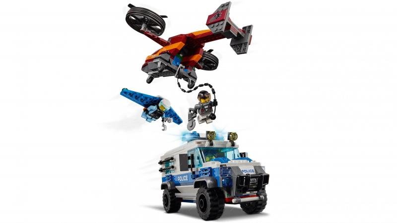 Hlídej ulice LEGO® City z nebes v parádní stavebnici 60209 Letecká policie a loupež diamantu, ve které najdeš policejní obrněný transportér s otevírací střechou a fungující světelnou a zvukovou kostkou, která vyjde v lednu 2019, vězeňskou celu a trezor na diamant. Tato akční policejní sada od LEGO City obsahuje také policejní jetpack, vrtulník padoucha s otočnými rotory, plastovým lezeckým lanem a otevíracím kokpitem, a navíc také 4 minifigurky.