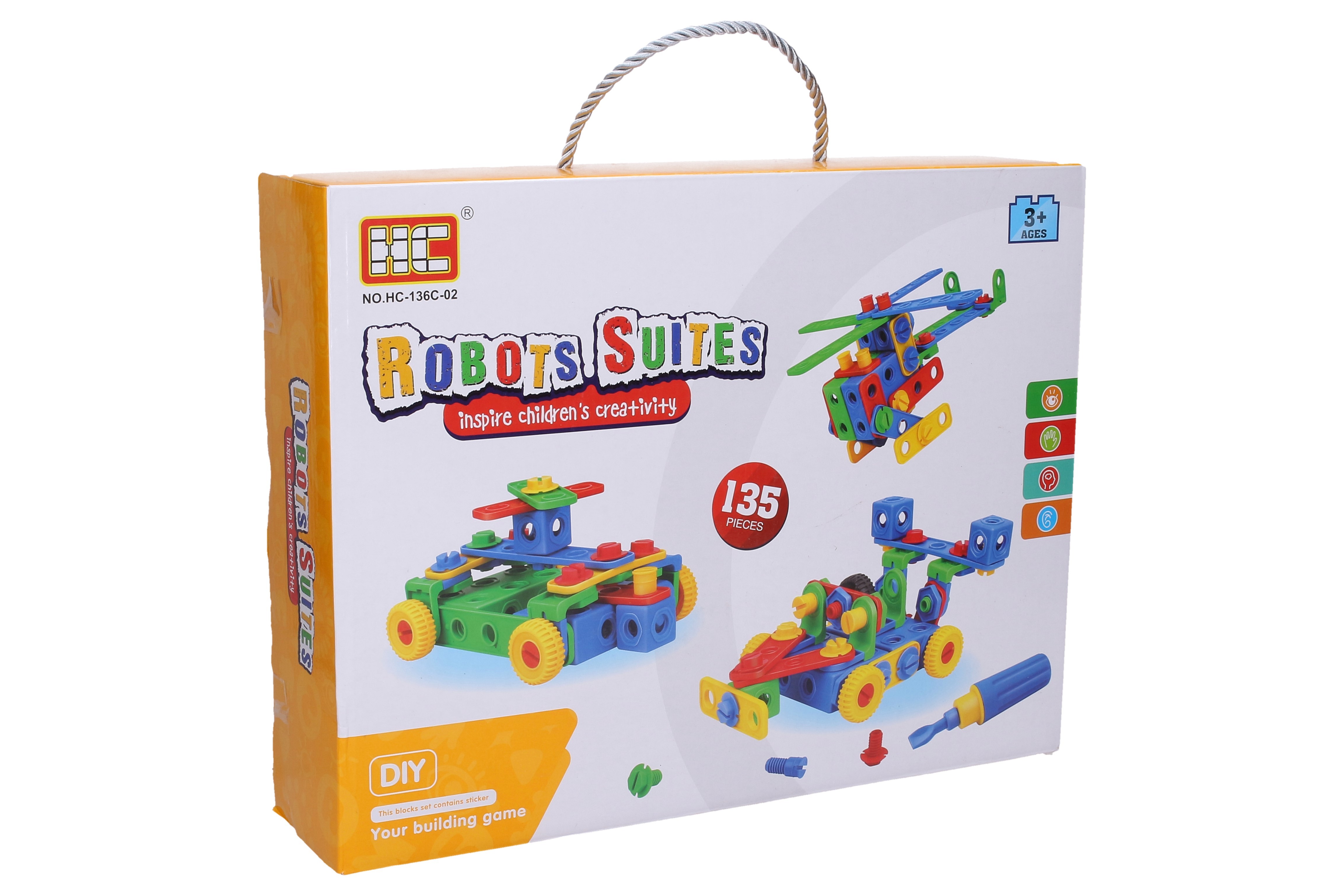 Stavebnice šroubovací. Obsahuje 135 dílků, šroubovák, a obrázky výrobků pro inspiraci. číst celé