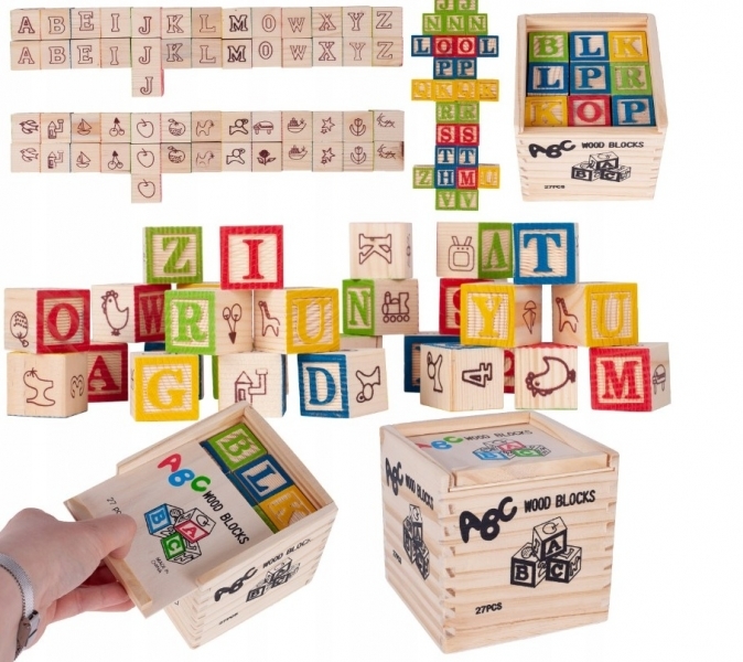 Dřevěné kostky 27 ks s písmeny, čísly a obrázky + dřevěná krabička. Skvělé barevné kostky, ze kterých můžete vytvářet různé konstrukce, jsou ideální pro učení čísel a písmen. Můžete z nich vytvářet různá slova, sčítat a odečítat čísla.
