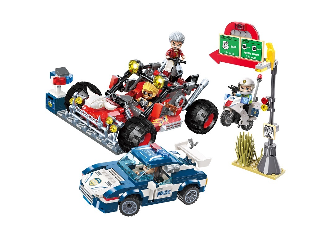 Zahajte stíhaní zločinců a to co nejrychleji! V balení policejní auto, policejní motorka, 2 figurky policistů, auto zločinců, 2 figurky zločinců. Vyrobeno z netoxického ABS plastu, v balení 610 dílků.
