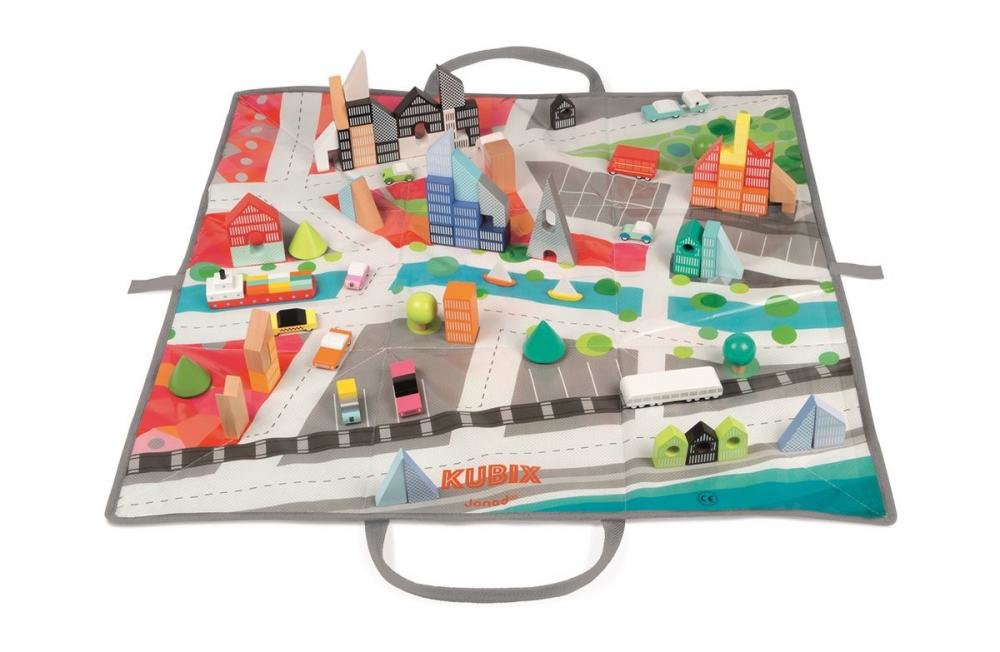 Dřevěné kostky Kubix Město 70 ks Janod stavebnice s interaktivní podložkou od 2 let