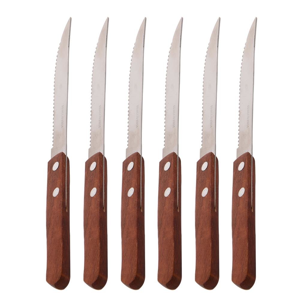 Nůž kuchyňský steakový se zubatým ostřím si hravě poradí nejen s grilovaným masem. Využijete ho především při venkovním grilování, ale bude se hodit i v domácnosti. Sada 6 kusů. Materiál: nerez, dřevěná rukojeť. Rozměry: délka 20,5 cm, délka čepele 11 cm.