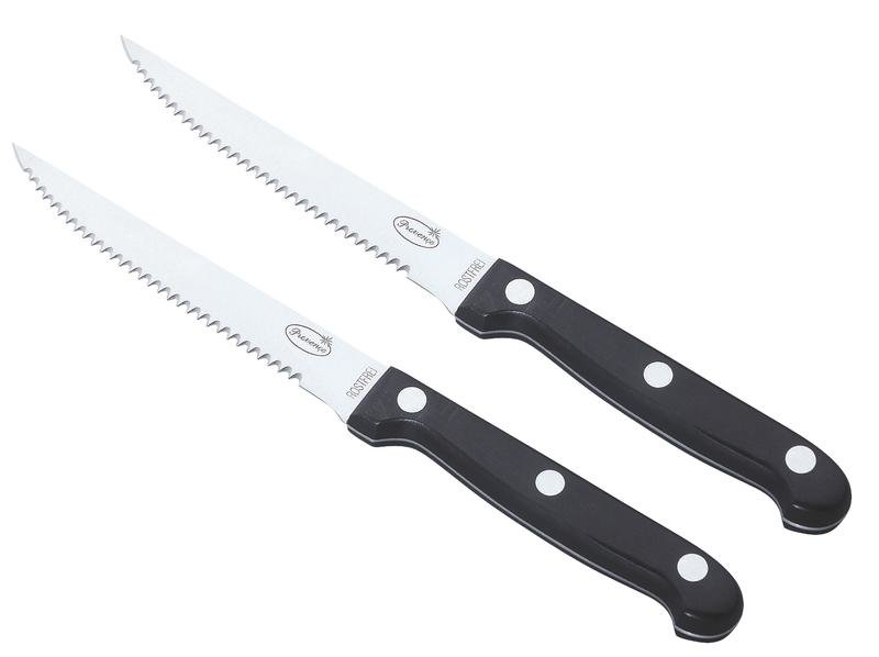 Steakový nůž 2ks, délka ostří 11, 4 cm, opatřena zoubky pro snadné krájení masa, netupí se, z kvalitní nerez oceli, rukojeť z tvrdého, odolného černého plastu, vhodný jako příborový nůž na krájení masa a zeleniny. Vhodný do myčky na nádobí. Rozměry - 21, 8 x 1, 6 cm. číst celé