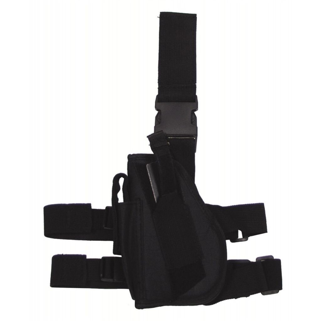 Stehenní pistolové pouzdro s elastickými nastavitelnými páskami na suchý zip. Určeno pro levoruké střelce. Kapsa na zásobník (9 mm) ze strany pouzdra. Zajištění zbraně v pouzdře pomocí Velcro pásku.