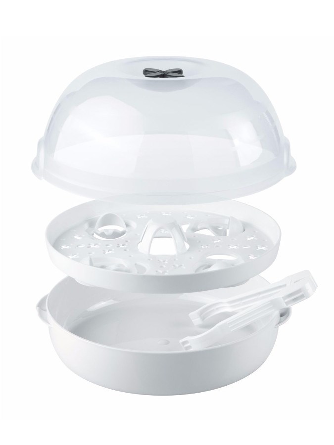 Sterilizátor do mikrovlnné trouby Vario Express Plus Nuk. Parní sterilizátor do mikrovlnné trouby Micro Express Plus NUK až pro čtyři lahve a příslušenství, rychlý, účinný a důkladný. Je ideální pro každodenní sterilizaci kojeneckých lahví (kromě PA láhví) a příslušenství, které jsou vhodné do mikrovlnné trouby. Sterilizuje až čtyři lahve a příslušenství za pouhé čtyři minuty (nastavení výkonu na 1 000 wattů) se snadnou obsluhou. Součástí balení jsou kleště na láhve pro hygienické vyjmutí. Pozor na minimální potřebnou velikost mikrovlnné trouby. Rozměry: výška cca 18-19 cm, šířka cca 30 cm, hloubka cca 29-30, obvod cca 83 cm.