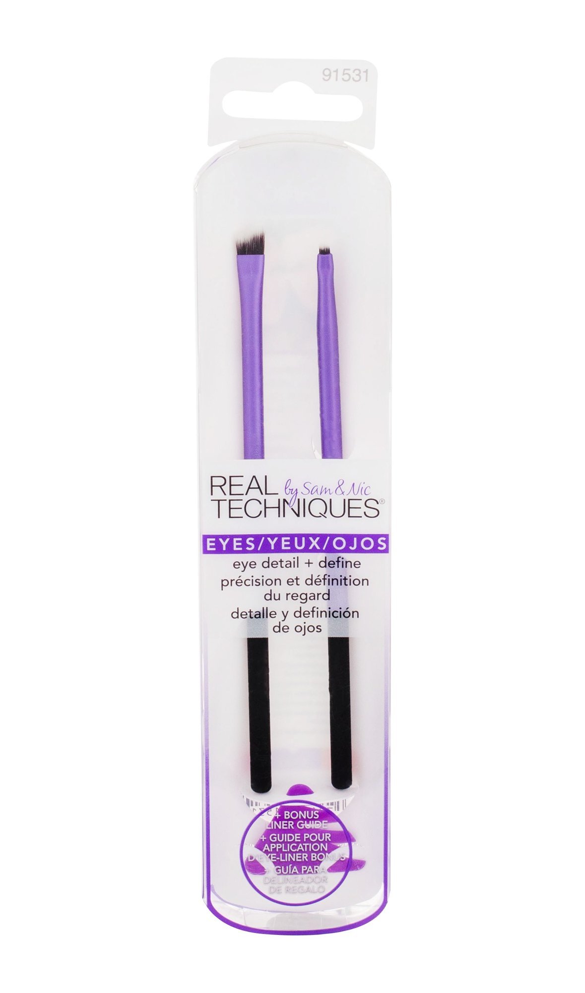 Sada pro dokonalý tvar očí **Real Techniques Eyes Eye Detail + Define.** **Složení kazety:** **kosmetický štětec pro oční linky Definer Brush 1 ks** Slabý štětec s kolmo střiženými vlákny vytvoří precizní linku podél linie očních řas. **detailní štětec pro oční linky Square Detailer Brush 1 ks** Tenký štětec s krátce střiženými úzkými vlákny vytvoří precizní linku v detailech oka, převážně ve vnějším koutku oka, čímž vytvoří například nádherné kočičí líčení. **pomůcka pro vytvoření očních linek Liner Guide 1 ks** Plastová pomůcka trojúhelníkového tvaru umožní vytvořit až 3 různá zakončení, od krátkého zakončení, přes dlouhé kočičí zakončení až po dvojité zakončení očních linek. Lze použít s tekutými, gelovými, krémovými i pudrovými očními linkami nebo očními stíny.