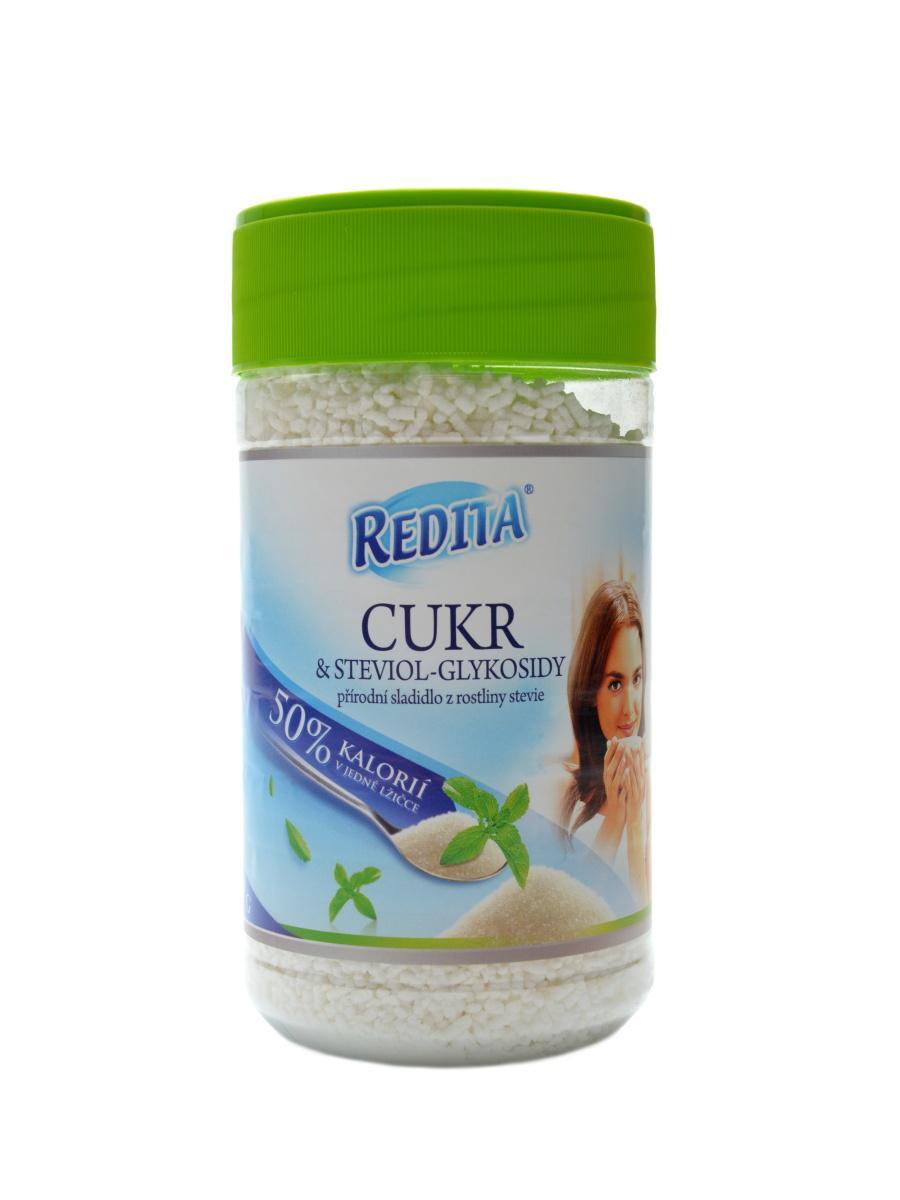 pozitivní zdravotní účinky pomáhá ke snížení krevního tlaku pomáhá rozšiřovat cévy má silné antibakteriální efekty má silné antivirové efekty má silné antioxidační efekty Tuto podivuhodnou rostlinu využívali domorodí indiáni v subtropických a tropických oblastech Jižní Ameriky již od nepaměti nejenom pro její sladkost (prakticky všechny části rostliny jsou zhruba třicetkrát sladší než řepný cukr), ale i pro v dnešní době již prokázané pozitivní zdravotní účinky - snižuje krevní tlak, rozšiřuje cévy, má silné antibakteriální, antivirové a antioxidační efekty... a takovýmto bonusem se nemůže pochlubit žádné jiné sladidlo! Abychom nemuseli přežvykovat části rostlin, tak se v současné době používá extrakt, který vykazuje ještě o řád vyšší sladivost (zhruba až třistakrát větší než řepný cukr) a tím se zcela po této stránce vyrovná ostatním umělým sladidlům. Redita Cukr a Stevia