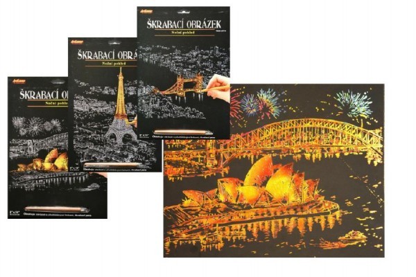 Škrabací obrázek zlatý 20 x 25 cm Sada obsahuje obrázek natištěný na černém kartonu a umělohmotné škrabací pero s kovovým hrotem. Seškrabte linky předtištěného obrázku. Vhodné pro děti od 6 let.