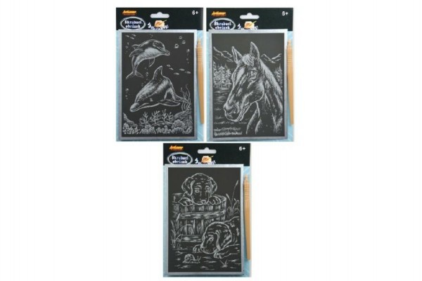 12 nejrůznějších motivů bez možnosti výběru. Po seškrábání linek předtištěného obrázku se Vám objeví krásný rytinový obrázek, který se pěkně leskne z různých úhlů pohledu. Vhodné od 6 let.