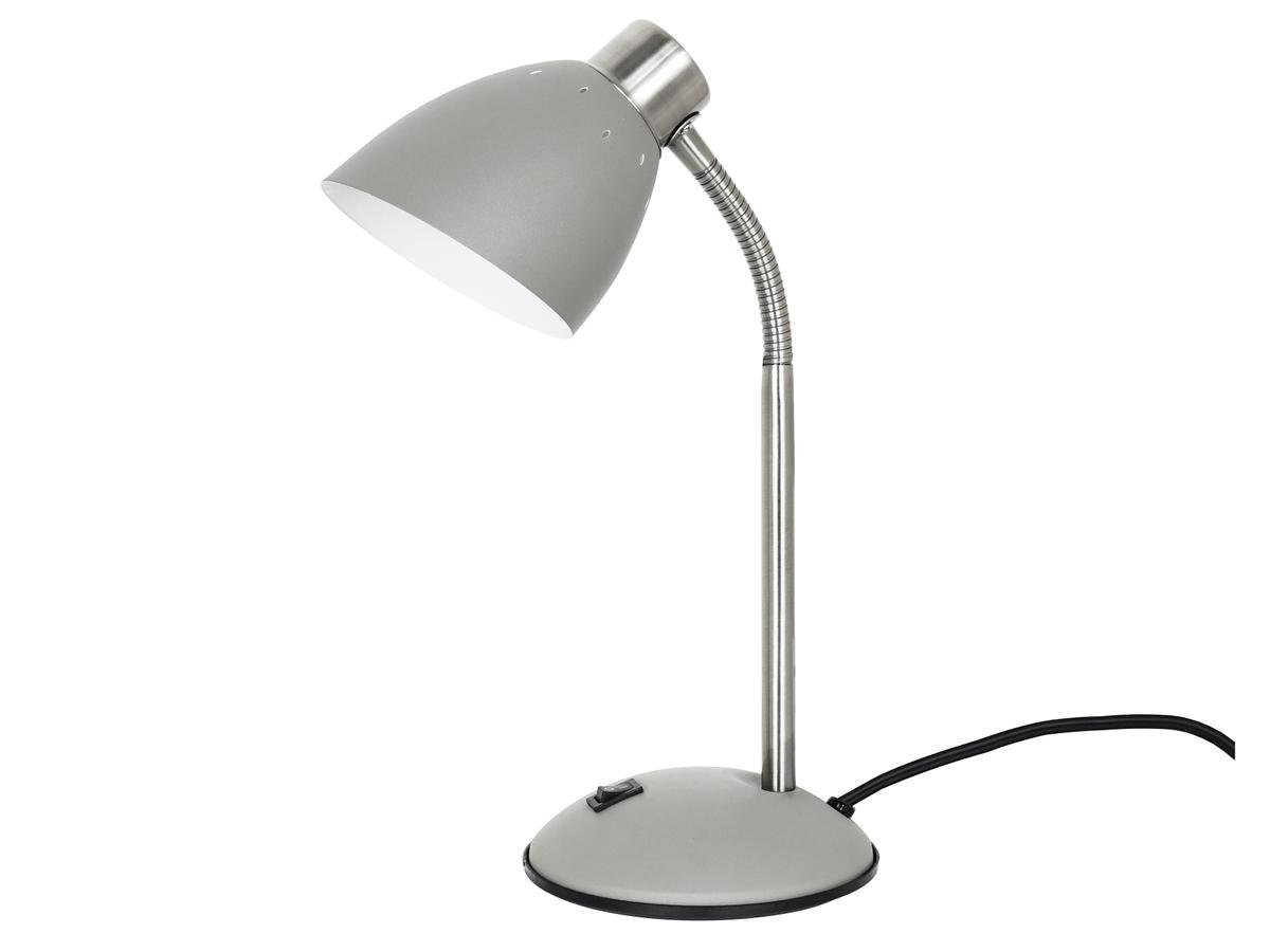 Stolní lampa v matné šedé barvě na stříbrné noze.