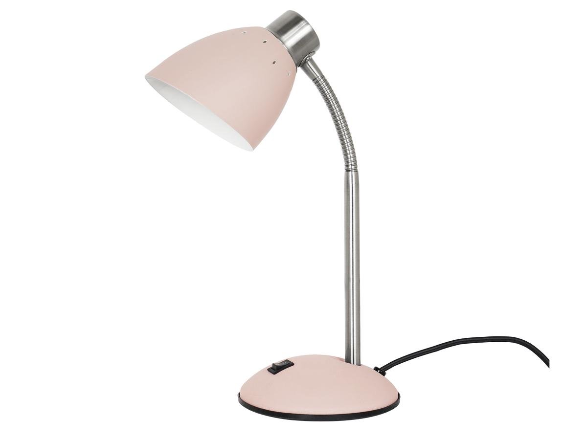 Stolní lampa v matné růžové barvě na stříbrné noze.