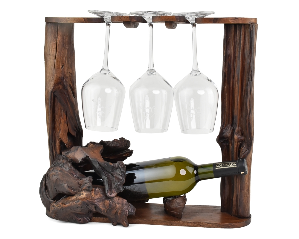 Přírodně vypadající stojan na tři sklenice a láhev vína z teakového dřeva. Vhodný doplněk především do interiéru s dřevěnými prvky. Boční tyče umožňují jednoduché uchopení a přenášení.Parametry: Váha: cca 1,9 kg Rozměry: 38 x 38 cmHloubka: 16 cmRozměr uložiště pro láhev: 10 x 10 cm