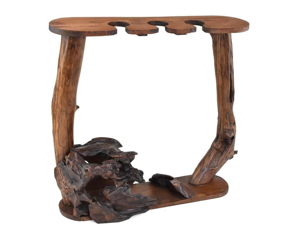 Přírodně vypadající stojan na tři sklenice a láhev vína z teakového dřeva. Vhodný doplněk především do interiéru s dřevěnými prvky. Boční tyče umožňují jednoduché uchopení a přenášení.Parametry:Váha: cca 1,7 kgRozměry: 38 x 43 cmHloubka: 18 cmRozměr uložiště pro láhev: 10 x 10 cm