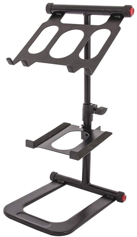 Univerzální nastavitelný kovový držák notebooku pro hudebníky a DJe. Je vhodný i pro Mixpult, CD přehrávač atd ... Vrchní deska je naklonitelná, výškově nastavitelná a otočná o 360°.