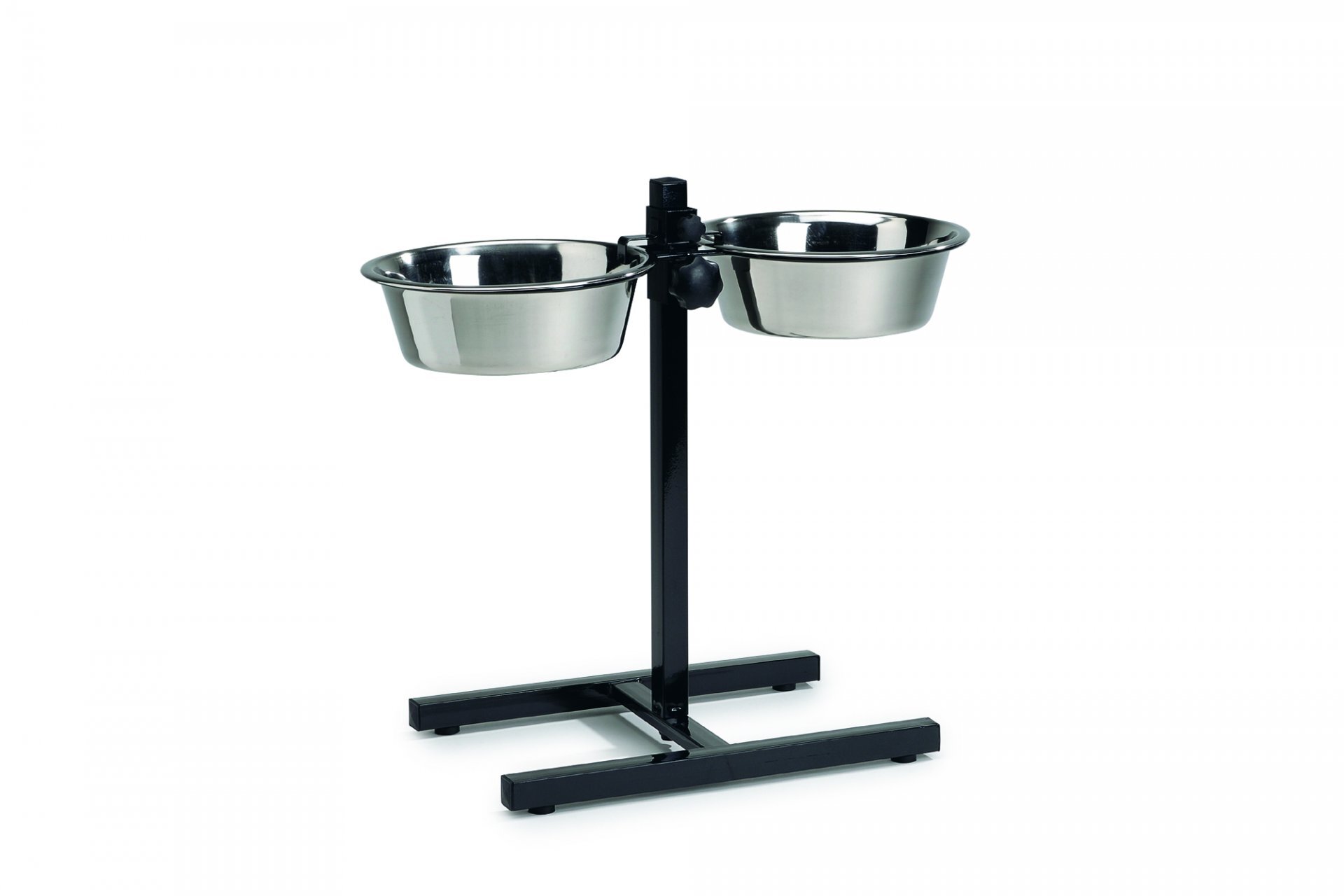 Hledáte způsob, jak mít misku na krmivo a misku na vodu pro Vašeho pejska na jednom místě? Pak je právě pro Vás ideální tento stojan Beeztees na dvě misky. Tyto misky z nerezové oceli mají kvalitní lesklý povrch, který jim dodává stylovější vzhled. Stojan má navíc na spodní straně gumové protiskluzové krytky, které zabraňují klouzání a chrání Vaši podlahu před poškrábáním. Misky z nerezové oceli lze mýt v myčce. Kovový rám černé barvy, výškově stavitelný 2 misky z nerezové oceli. Protiskluzový. Misky z nerezové oceli vhodné do myčky. Průměr misky 25 cm. Objem: 2 x 2530 ml.