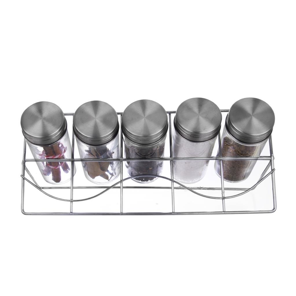 Stojan s 5ti kořenkami Vám umožní mít Vaše oblíbené koření vždy po ruce. Můžete ho umístit na volnou plochu kuchyňské linky všude tam, kde je právě zapotřebí. Přehledně uloží základní druhy koření. Materiál: stojan - chrom, skleněné kořenky jsou opatřeny plastovými sypátky a nerezovými víčky na závit. Rozměry: stojan 25x10x10 cm, kořenka objem 0,1 l, pr. 4 cm, v. 9,5 cm.