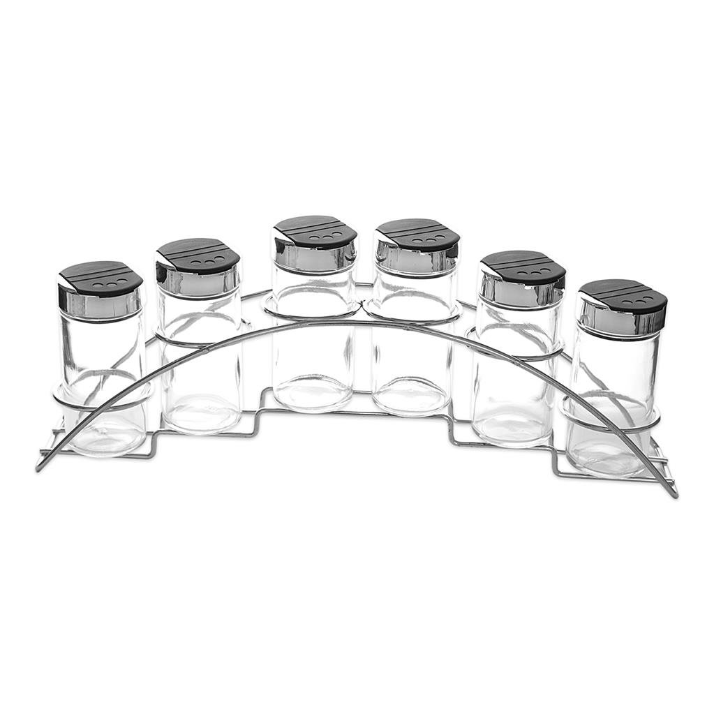 Drátěný stojan se 6ti kořenkami Vám umožní mít Vaše oblíbené koření vždy po ruce. Můžete ho umístit na volnou plochu kuchyňské linky všude tam, kde je právě zapotřebí. Přehledně uloží základní druhy koření. Materiál: stojan - chrom, skleněné kořenky jsou opatřeny plastovými víčky PP s otvíracími sypátky PP. Rozměry: stojan 33x6x14 cm, kořenka objem 0,1 l, pr. 4 cm, v. 10 cm.
