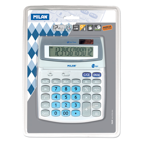 Stolová 12-místná kalkulačka MILAN s nastavitelným úhlem pohledu. Kalkulačka má velké plastové tlačítka, která jsou navíc barevně rozlišeny. Výhodou je duální napájení: 1,5 V baterie + solární panel. Kalkulačka má rozšířené funkce jako výpočet%, opravné tlačítko, paměť se třemi tlačítky, změnu...