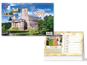 Stolní kalendář na rok 2018 s obrázky známých českých hradů a zámků. Na každé stránce kalendáře jsou fotky českých památek a krátká historie. V kalendáři jsou označené státní svátky, jmeniny, fáze měsíce, název aktuálního měsíce, kolikátý je to týden v roce. Možnost dotisku firemního loga a textu na spodní stranu kalendáře.