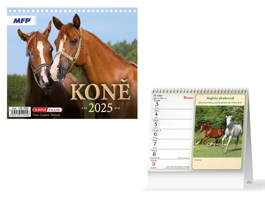 Stolní kalendář na rok 2025 mini s názvem Koně. Kalendář je určený pro milovnice a milovníky koní. Vhodný pro zapisování důležitých poznámek, k organizování různých událostí každodenního života. Možnost dotisku firemního loga a textu na spodní stranu kalendáře.