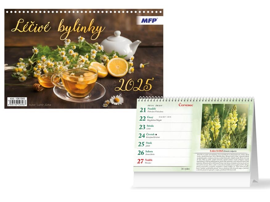 Stolní kalendář na rok 2025 s názvem Léčivé bylinky. Kalendář je určený pro milovníky léčivých bylinek. Každý týden se seznámíte s jednou léčivou bylinkou. Vhodný pro zapisování důležitých poznámek, k organizování různých událostí každodenního života. Možnost dotisku firemního loga a textu na spodní stranu kalendáře.