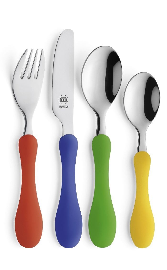 -Materiál: nerezová ocel/plast-barva: žlutá/zelená/modrá/červená/stříbrná-sada obsahuje:-jídelní nůž a vidlička-lžíce a čajová lžička