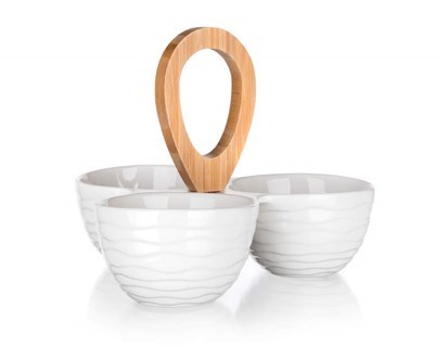 Miska je z kvalitního porcelánu, který je odolný a snadno se čistí. Bambusový držák dodává celému designu moderní a přirozený vzhled, který zaujme každého hosta. Rozměry 24 x 24 x 18,5 cm poskytují dostatek prostoru pro rozdělení oříšků, sušeného ovoce, oliv nebo jiných drobných pochutin, aniž by se jednotlivé druhy promíchaly.