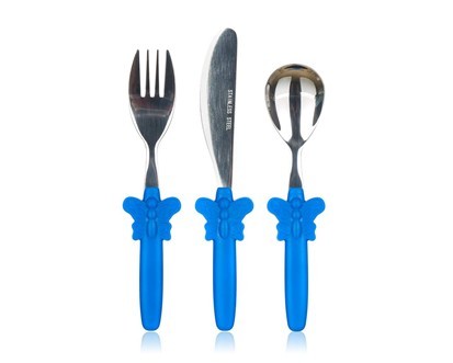 3dílná sada dětských příborů WING s plastovou rukojetí v designu motýla. Sada obsahuje jídelní lžíci 15 cm, jídelní nůž 17 cm, jídelní vidličku 15,7 cm.